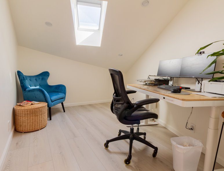 By enclosing the high ceiling, this home now has a quiet office retreat.Services: High-Ceiling Additions.Features: Exterior Windows & Doors (Skylight) & Interior Doors.